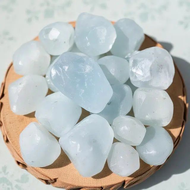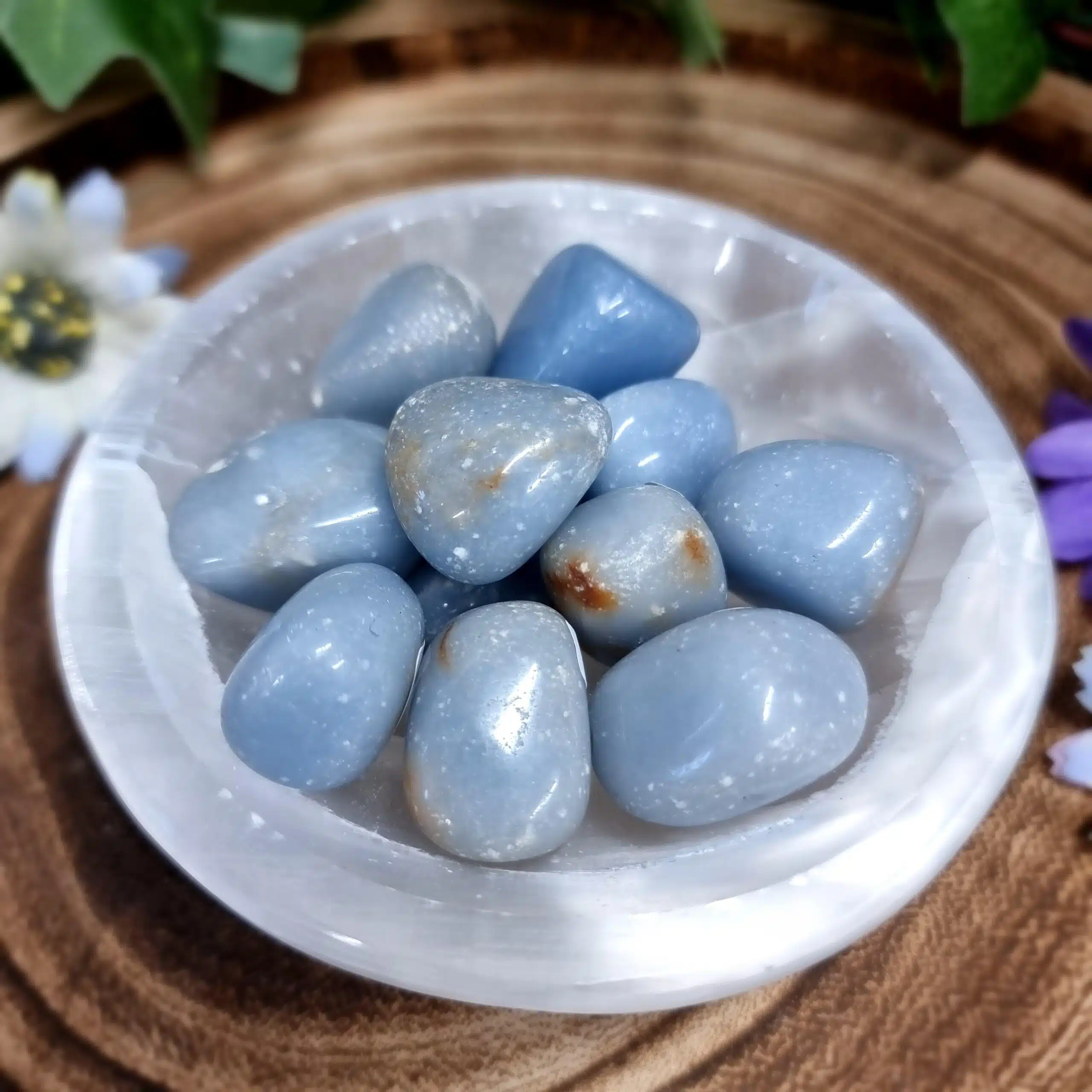 - Angelite Crystal Tumblestone is a soothing and calming stone that promotes peace and tranquility. Its soft blue color helps with stress relief and emotional balance. When held or placed in your environment, Angelite fosters a deep sense of serenity, allowing for clearer communication and enhanced spiritual connection.