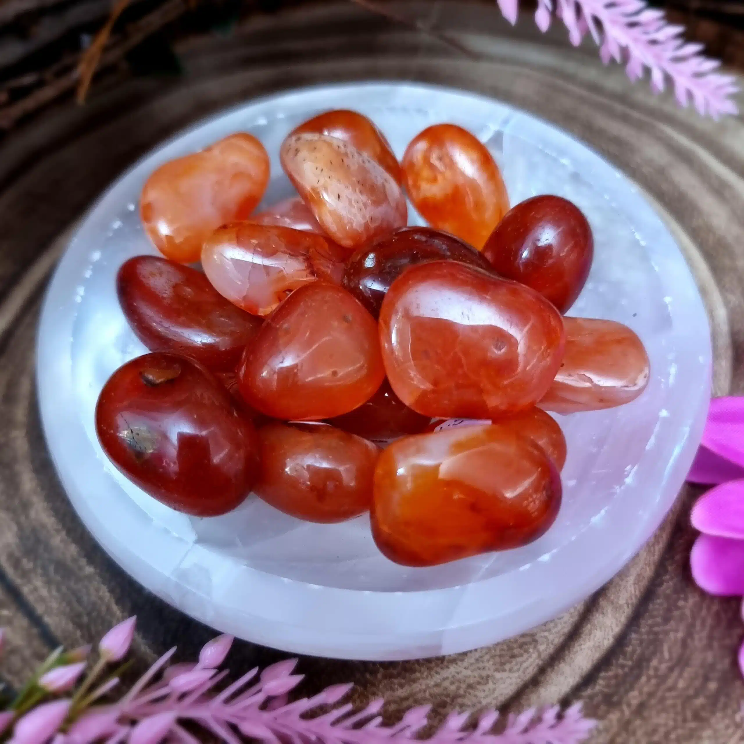 - Carnelian crystal tumblestone is a powerful stone known for its vibrant energy and motivational properties. This stunning orange-red crystal enhances vitality, boosts confidence, and inspires creativity. By stimulating the sacral chakra, it encourages passion, ambition, and a strong sense of purpose. Many people use Carnelian to overcome procrastination and increase determination, making it an excellent stone for goal-setting and personal growth.