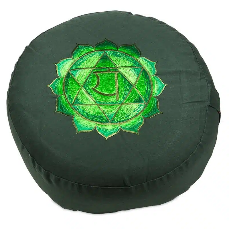 Yogi & Yogini meditation cushion with embroidered chakra symbol on top and chakra name on the handle.